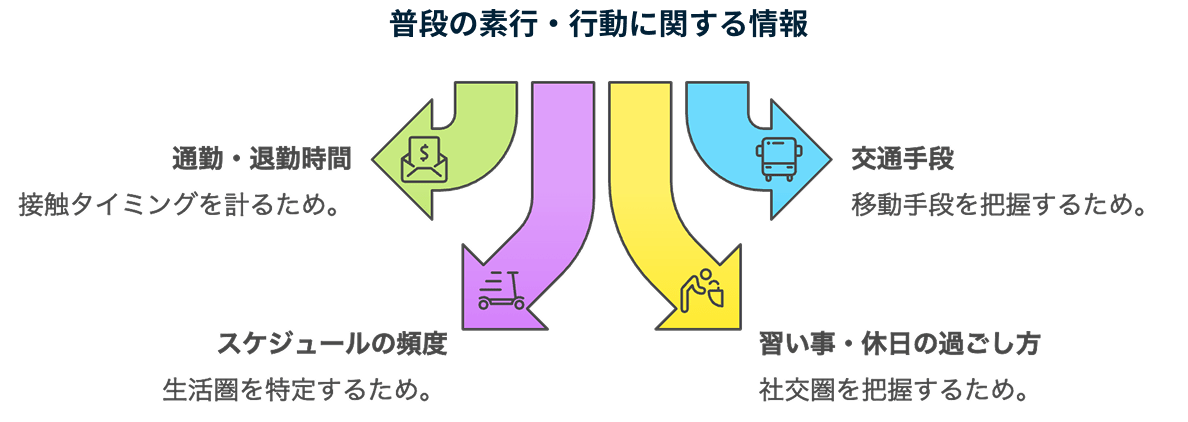 例えば通勤・退勤時間や交通手段、スーパーへ行く頻度や時間帯、習い事や飲みに行くこと、休日の過ごし方等が該当します。