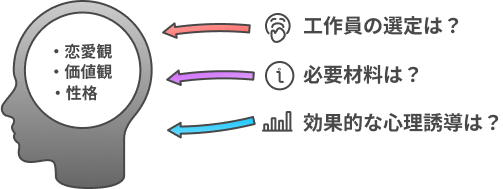 また説得力のある話をするには、工作員が対象者と共通項が多く共感がもてる人物設定だったり対象者が憧れるような存在であるか、そして運命(縁)を感じずにはいられないようなイベント作りをどこまで細かく行うかが鍵を握ります。