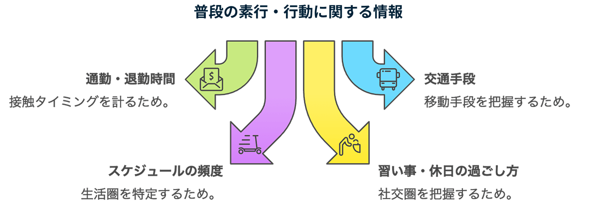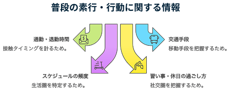 対象者の所在地や普段の素行という行動に関する情報