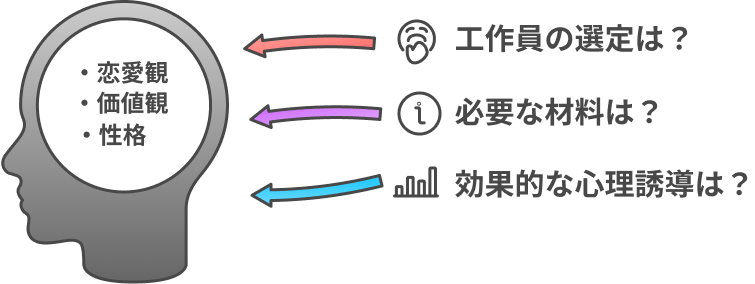 不倫相手と別れさせるかについては工作員の質も重要ですが、作成した材料(「隠し事」「嘘」「浮気」「侮辱」)を効果的に使用するかが鍵を握ります。