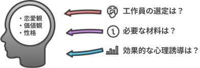 ・工作員がその2人の片方に接触することで、その相手に対する「隠し事」「嘘」「浮気」「侮辱」という類のものを誘導作成する作業