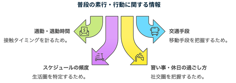 例えば通勤・退勤時間や交通手段、スーパーへ行く頻度や時間帯、習い事や飲みに行くこと、休日の過ごし方等が該当します。